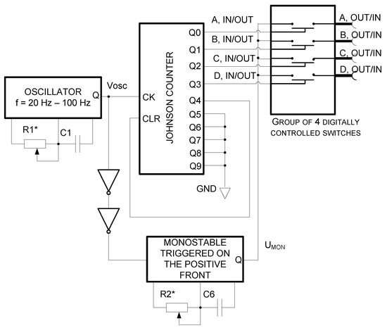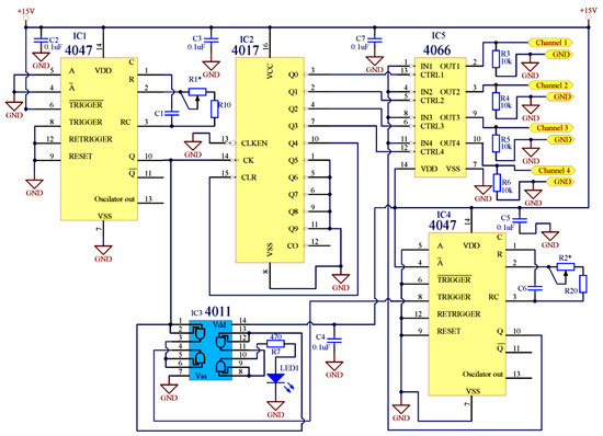 The first CD4047 oscillator generates a rectangular Vosc voltage signal with a frequency between 4 and 100 Hz. As the CD4047 oscillator is set as an astable multivibrator τosc = 4.4 R1 C1, the variable resistance limits must be calculated accordingly to Equations (2)–(4). The C1 has a fixed capacitance value of 100 nF. It results in fmax = 100 Hz and fmin = 4 Hz.