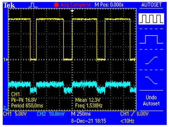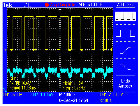 However, if and C1 = 100 nF, it can be determined that R10 = 22.7 kΩ and = 528 kΩ. A 500 kΩ potentiometer must be chosen and connected in series with a 20 or 22 kΩ fixed resistor and one 100 nF capacitor to adjust the oscillator frequency to be between 4.3 and 113 Hz (see Equations (2)–(4)).