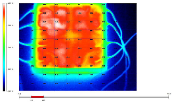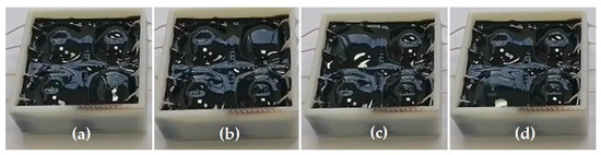 An ABS box was 3D printed to be used as a support for both E-type ferrite cores and to retain the magnetic fluid (see Figure 1). This box is composed of four equal squared compartments 20 mm in length. The 3D-printed wall has a thickness of 2 mm. E-type ferrite cores also have the same length of 20 mm, and each central leg has a squared surface of 5 × 5 mm2. Each lateral leg has a surface of 5 × 3.5 mm2. The overall ferrite height is 10 mm, and the space between legs is 4 mm. This space was used to mount the coils. Each coil support has a 6 mm squared hole to be suited to the leg surface, and the useful winding surface is 4 × 6 mm2. The coil support has a height of 6 mm. The coil winding wire had a diameter of 0.06 mm, and the coil had a number of 1534 turns. The same 2 mm wall thickness was used as a spacer in simulations. The inner box height was 16 mm to let the magnetic nanofluid be poured a little above the coils and E ferrite cores and to have space to observe the magnetic nanofluid 3–4 mm inflation without spilling the fluid across the outside walls. Any E-type soft ferrite with a total flux path length of 20 mm could be used, but the recommended core materials for lower than 200 kHz frequencies are 3C81, 3C90…93.