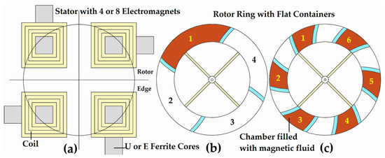 In Section 3, three applications were identified: a small and light rotor filled with magnetic nanofluid, a round flat pumping tube and a bioreactor probe coated with magnetic nanofluid containing mixing fluids. This bioreactor probe could use a single or double-sided stator with pulsatory rotating magnetic fields for actuation.