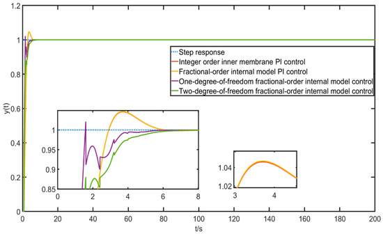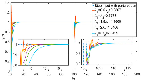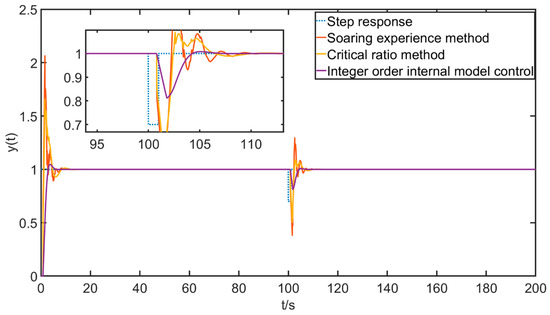 As can be seen from the graphs and tables, when , the two-degree-of-freedom internal mode control will be out of tune, failing to meet the control requirements and becoming even worse than the general one-degree-of-freedom internal mode control, which has no research value, while when , this two-degree-of-freedom internal mode control is equivalent to the one-degree-of-freedom internal mode control. Finally, as for the case of , the control effect is significantly improved; as increases, the rising curve becomes smoother and more resistant to disturbances, but the adjustment time required to reach the 5% error band increases significantly. Therefore, it is also necessary for the researcher to take the appropriate value of for the control needs and quality in the actual situation.