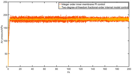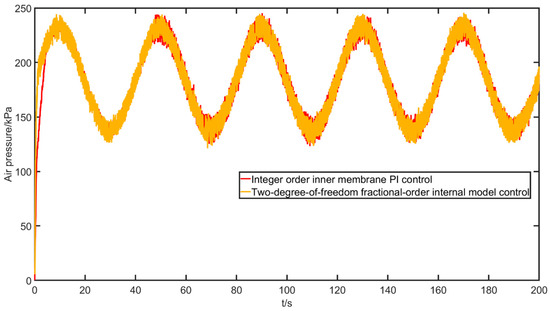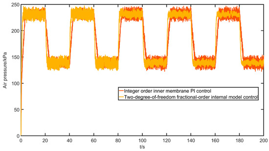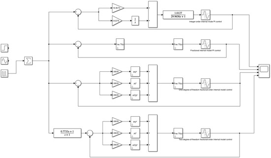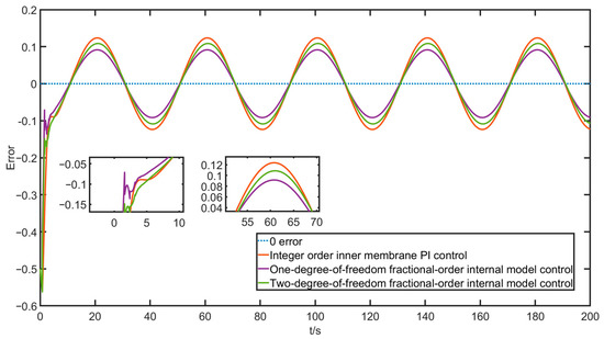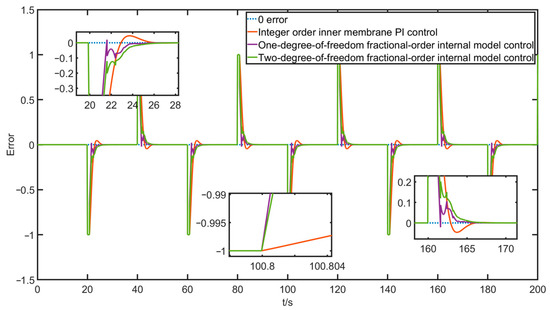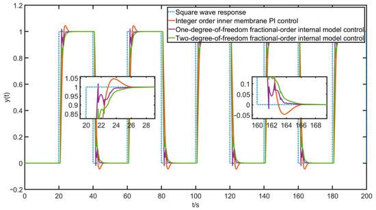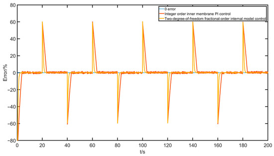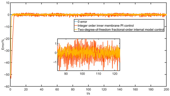 From the simulation curve of the square wave signal, the tracking error, and the above step and sine simulation experiments, the following conclusions can be further drawn. The overshoot of the two-degree-of-freedom fractional-order internal mode control algorithm is almost , and the rising curve is relatively smooth with almost no excess oscillation. Although the time used to reach the steady state is not as fast as the absolute radical one, it is acceptable within certain limits, which proves the effectiveness of the fractional-order model and the superiority of the two-degree-of-freedom fractional-order internal mode control.