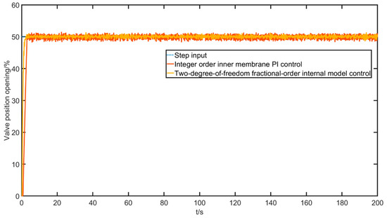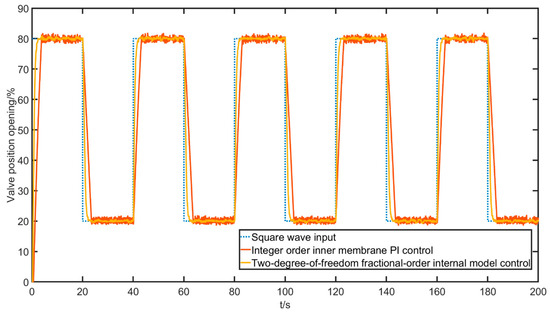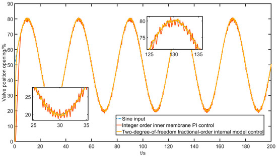 RMSE (root mean squared error) and MAPE (mean absolute percentage error) metrics are introduced here to measure the control quality. It can be seen that the two-degree-of-freedom fractional-order internal model control algorithm has significant advantages in terms of overshoot and speed. Then, a sinusoidal signal input experiment is conducted to test the dynamic performance and following characteristics of the control algorithm, given a desired valve opening signal with the shape . The experimental results are shown in Figure 26, Figure 27 and Figure 28.