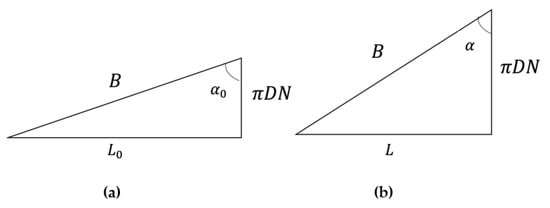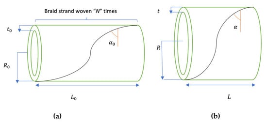 Developing a precise force model plays an important role in the accurate prediction of the actuation behavior of PAMs. The force model should incorporate all geometrical parameters of the bladder and the braid that can considerably influence the performance of PAM. The important characteristics of the bladder, which is a hollow elastomeric cylinder, are its initial outer radius (), initial length (), and initial thickness (), as shown in Figure 1. On the other hand, the braided sleeving is distinguished by its initial braid angle (), the length of one of its strands before being woven around the bladder (), and the number of turns this strand makes from one end of the bladder to another () [44]. As shown in Figure 2, these parameters are related to each other as: