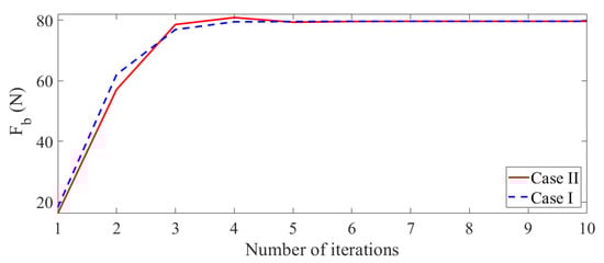 In the first step, to determine the contributing effects of the braid geometry on the maximized blocked force and the optimal dimensions of an MPAM, a comparison is made between Cases I and II described in Section 3.1 and Section 3.2, respectively. The optimum design variables and the blocked force obtained for each case are presented in Table 2. For the sake of clarity, the results are only presented for an inlet pressure of 200 kPa; however, similar results were obtained for other operating pressures. As demonstrated in Table 2, the braid strand parameters do not influence the optimum values of the design variables common in both optimization formulations (). The results demonstrate that the contribution of the braid force has a very slight effect on the maximized blocked force. Hence, optimizing the braid strand parameters included in the term that represents the braid force () does not have any effect on optimizing the design of an MPAM to maximize the generated blocked force and can therefore be neglected. This would also lead to a simpler and more cost-effective MPAM that can be fabricated using braids available on the market instead of a customized braided sleeving. Figure 4 illustrates the iteration history for both optimization cases. The iteration number represents the number of times the optimization algorithm was run before converging to the optimum values. As mentioned previously, Case I comprises five design variables, while Case II comprises three design variables. However, the initial values for the design variables that were common in both cases were equal to make the initial conditions of the optimization algorithm similar for both cases. The value of the objective function for both cases converges to the same optimum blocked force, confirming that both cases lead to the same optimized dimensions for the MPAM.