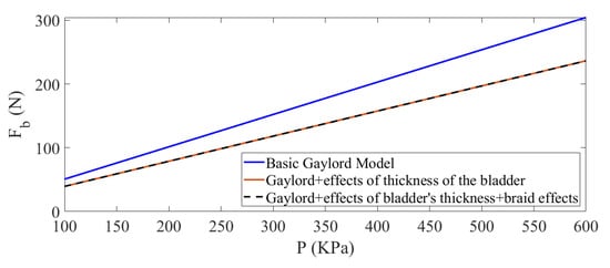 Figure 5 shows the variation of the optimal blocked force with respect to inlet pressure using different models, including the basic Gaylord model, the Gaylord model incorporating the effects of the thickness of the bladder, and the Gaylord model including the effects of the bladder’s thickness and energy stored in the braid. The magnitude of the blocked force anticipated by the simple Gaylord model is clearly higher than the calculated amounts of blocked force using the other two models, particularly at higher pressures. This is due to the fact that the thickness of the bladder, which plays a major role in the generated force by an MPAM, is not considered in the Gaylord force model. On the other hand, there are no significant differences between the anticipated amounts of force using the other two models, confirming that the correction term due to the effects of the braided sleeving does not make a noticeable difference in the level of accuracy of the force prediction. Thus, the Gaylord model incorporating the effects of the thickness of the bladder can be effectively used to accurately predict the blocked force in MPAMs.