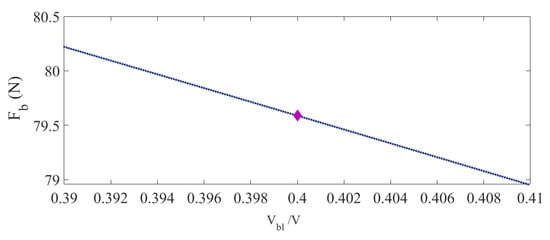 Further examination of the optimal design parameters reveals that the radius of the bladder and the braid angle are converged to their upper bounds, which is justifiable based on the existing relationship between each dimensional parameter of an MPAM and its force output [29,30,54,55]. Moreover, the nonlinear constraint on the volume ratio is active on its lower bound. To investigate the effect of the lower bound of the volume ratio on the optimal blocked force, a post-optimality analysis was conducted in which the optimal solution was evaluated by varying the lower bound of the volume ratio (q) by ±2% around its original value of 0.4, while other constraints were kept the same. The new optimum points and the cost function are reported in Figure 6 and Table 5. As indicated in Table 5, there is no change in the optimal values of the bladder radius and the braid angle, while the bladder thickness increases by increasing q. Figure 6 illustrates that the optimal blocked force also reduces linearly with an increase in q, which is attributed to the increase in the optimum thickness of the bladder. Results suggest that reducing q by 2% yields an increase in the blocked force by almost 1.5%. In the present study, based on the dimensional constraints that exist in the design of MPAMs for small-scaled robotic systems, is limited to 0.4.