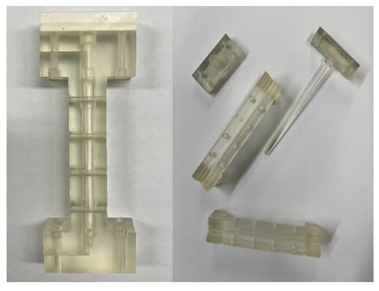 In this study, the MPAM was fabricated using low-cost materials that are commercially available. Before assembling the actuator, a customized bladder must be fabricated with the required optimal dimensions because such dimensions cannot be found in any of the silicone tubes available on the market. To that end, a 3D-printed mold (illustrated in Figure 7) was fabricated using a FormLabs Form 3+ printer with an accuracy of 25 and clear B4 resin. Each of the two outer halves contains a semicircular groove with an inner diameter of 3 mm to form a bladder with the required outer diameter (6 mm). Due to the limited accuracy of the equipment used for the experiment, the optimal thickness of the bladder is set to 0.7 mm; therefore, the diameter of the inner cylinder that matches the inner diameter of the bladder is set to 4.6 mm to yield a tube with the required thickness of 0.7 mm. The components of the mold are screwed to each other using the embedded holes on each part. Since the length of the bladder does not affect the blocked force, it is set to 50 mm for the sake of miniaturization. However, the mold is designed with a length of approximately 60 mm, which is equal to the active length of the MPAM, plus a further 10 mm to account for the parts that overlap the end fittings. After fabrication of the mold, the material of the bladder is prepared by mixing parts A and B (1:1) of Ecoflex-50 silicone (Smooth-On, Inc., Macungie, PA, USA) for 40 s inside a vacuum mixer (Thinky (Laguna Hills, CA, USA), ARV-200) with a speed of 2000 rpm and under a pressure of 27 inHg to eliminate all the air bubbles. The silicone mixture is then injected into the mold (the cavity between the outer and inner cylinder) and cured for 24 h at room temperature to form a cylindrical tube for the bladder. A braided sleeving with a nominal diameter of 6.35 mm and a braid angle of 72 degrees was chosen after procuring a variety of PET (polyethylene terephthalate) braids from the supplier and measuring their respective braid angles (TechFlex®–Clean Cut (CCP0.25BK)). The braided sleeving is then cut to the same length as the silicone tube to completely cover the bladder. The end of the braided sleeving is burned to prevent fraying. Finally, two end fittings are tightly placed inside the inner diameter of the bladder to seal the ends of the MPAM. The various components of the MPAM and its assembled configuration are illustrated in Figure 8 and Figure 9, respectively.