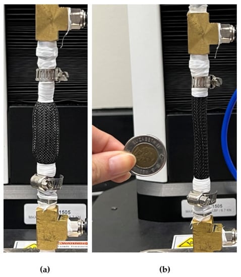 Recent advances in small-scale biorobotic systems have heightened the demand for the development of actuation systems that are power-efficient and capable of producing large amounts of force while being compact and light enough to fit within these miniaturized systems. To reduce the size and weight of the conventional types of PAMs, Park et al. [15] designed a PAM capable of detecting its contraction length through hyperelastic strain sensing with embedded microchannels containing a liquid conductor. This resulted in a system with no external measurement device of significant size. Wakimoto et al. [16] developed a smart McKibben actuator with an integrated pressure sensor using a conductive material for one of the braid fibers. By monitoring the conductive fiber’s electrical resistance, the pressure was calculated. The pressure could also be regulated by sending feedback to the pressure sensor. Another self-sensing PAM capable of measuring capacitance to determine the length of the actuator and, consequently, its deformation was designed by Kanno et al. [17], employing a dielectric elastomer sensor (DES). Fu et al. [18] presented a multisensory yarn for PAMs that can detect variations in force, displacement, and vertical pressure. The developed actuator was also tested in numerous applications to demonstrate its usefulness. To reduce the overall length and weight of the PAM while maintaining the optimum contraction, Carvalho et al. [19] designed innovative end fittings, resulting in a shorter overall length of the muscle. Miniaturized artificial muscles (MPAMs) are the smaller version of PAMs, with the same advantages but a much smaller size and weight, which is intriguing for miniaturized applications, including wearable hand exoskeletons [20], cardiac compression devices, and manipulation tools for minimally invasive surgery [21]. Lathrop et al. [22] conducted a study on several MPAMs featuring different dimensions to be employed in flexible instruments essential for minimally invasive surgery (MIS). The finger utilized in robotic hand prosthesis designed by Markus et al. [23] was actuated by MPAMs, with an initial diameter of 10 mm and a thickness of 1.8 mm, as an alternative to electrically driven actuators. Ashwin and Ghosal [24] presented an endoscopic end effector actuated by three MPAMs to manipulate a catheter tip to a specific location. However, fabrication and modeling challenges are increased for MPAMs due to their small size. It has been reported that these actuators have low force and contraction outputs [25,26]. Given the extent of the applications of MPAMs, it is of utmost importance to enhance their design and efficiency.