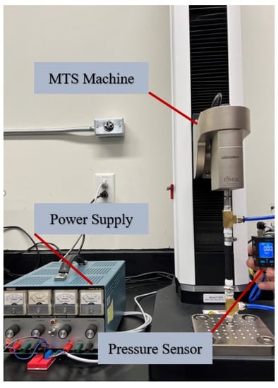 A test setup was designed to evaluate the performance of the MPAM under varying pressures and validate the optimization results. Quasi-static tests were conducted using an MTS machine (F1505; max load, 6.7 kN), which is capable of measuring both force and displacement (sensor mark-10; model FS05-50; max load, 250 N). The pressure supplied to the actuator was monitored using a pressure sensor (Festo® (Esslingen, Germany), SPAU-P10R-H-G18FD-L-PNLK-PNVBA-M12U). Figure 10 shows the MPAM installed within the test setup.