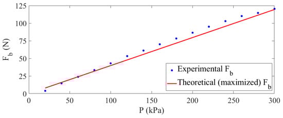 The results of the quasi-static tests are shown in Figure 11, displaying the variation of the blocked force produced by the MPAM with internal pressure. As observed in Figure 11, the MPAM initiates generating force when the inlet pressure reaches 20 kPa, which is the dead-band pressure for the designed MPAM. The dead-band pressure depends on the material of the bladder, as well as its thickness and diameter. Pillsbury et al. [13] showed that PAMs with higher volume ratios () require higher pressures (meaning a higher ) to produce the same amount of force as PAMs with lower volume ratios. Since the ratio of the volume of the bladder to the volume of the PAM is proportional to the ratio between the radius and thickness of the bladder, it can be concluded that a greater thickness can also result in an increase in the dead-band pressure. This can be explained by the fact that a higher force is needed to overcome the elasticity of a thick bladder during its deformation. The fabricated optimized MPAM has an extremely small thickness-to-radius ratio; consequently, it has a significantly low dead-band pressure and begins producing a higher level of force when the bladder is pressurized to lower pressures, thereby reducing the required energy input.
