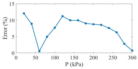 The results show that the blocked force increases nearly linearly with pressure, which is consistent with the findings of earlier studies [13,14,32]. Due to the imperfections in the tubular silicone and the limitations of the MTS machine, the maximum pressure was limited to 300 kPa, yielding a maximum blocked force of 120 N. A comparison between the experimental and theoretical results is also provided in Figure 11. A very good agreement exists between the optimized blocked force obtained using Equation (27) and the experimental results. The error between simulation and experimental results for the blocked force under various pressures is generally less than 10%, as shown in Figure 12. Since the dead-band pressure is neglected in the theoretical force equation, the highest error between the simulation and experimental results is found to be at the inlet pressure of 20 kPa (dead-band pressure for the designed MPAM), under which the MPAM starts generating blocked force. The minor discrepancies between the experimental and theoretical results can be attributed to the limitations of the fabrication and testing procedures, as well as the assumptions made during the derivation of the optimization formulation.