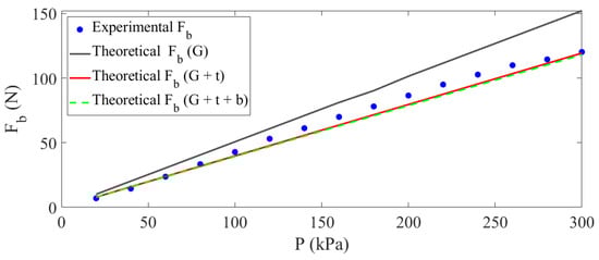 To complement the conclusion drawn from Figure 5, the optimized parameters were employed as inputs in three distinct froce models (G: simple Gaylord; G + t: Gaylord including the effects of the thickness of the bladder; and G + t + b: Gaylord incluidng the effects of the thickness of the bladder and the energy stored in the braided sleeving). Figure 13 compares the theoretical values of the blocked force obtained using the aforementioned force models with the experimental data. The results indicate that, in agreement with existing literature, the Gaylord model overestimates the blocked force in comparison to the other two eqations. Additionally, the results support the conclusions drawn from Figure 5 concerning the insignificant discreprency between force estimations using the second and third force equations.