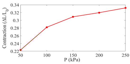 where is the initial active length of the actuator, and is the amount by which the MPAM contracts. Results for the contraction ratio under various inlet pressures are shown in Figure 14. The contraction ratio increases nonlinearly with pressure, in agreement with the trends reported in earlier studies [30,55]. It is interesting to note that as the pressure rises, the contraction ratio increases at a slower rate, indicating that the free contraction of the MPAM reaches a saturation at high inlet pressures. When the pressure increases from 50 kPa to 100 kPa, there is a sharp rise in the contraction ratio; however, the contraction ratio increases at a considerably slower rate between 100 kPa and 250 kPa. This behavior can be explained by the fact that the diameter of the bladder cannot expand beyond a certain value.