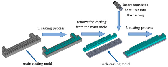 The actuators were produced using a two-step casting process, which required the design of two casting molds: a main mold and a side mold. The main mold was responsible for designing the main external and internal geometry of the actuator, as shown in Figure 2. The main casting mold was responsible for designing the side walls of the chambers, the bottom of the actuator, one side wall, and the two attachment segments at either end (one of which also contained the power supply channel).