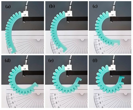 Bending motion sequence under pressurized air: (a) 0 kPa, (b) 50 kPa, (c) 100 kPa, (d) 150 kPa, (e) 200 kPa, (f) 300 kPa.
