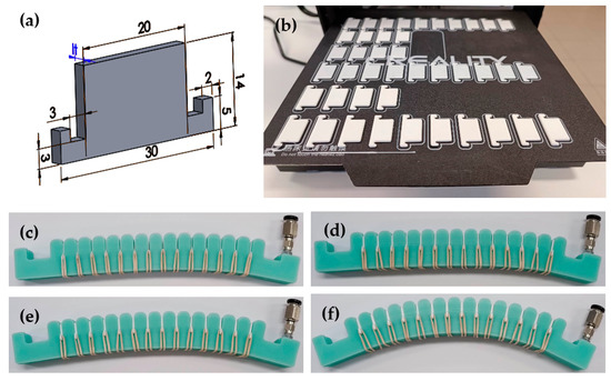Externally attachable inter-chamber plates: (a) Structure of inter-chamber plates. The values shown in the figure are given in [mm], (b) Fabrication of the plates with 3D printer, (c) 0.5 mm thick plates placed on the actuator, (d) 1 mm thick plates placed on the actuator, (e) 1.5 mm thick plates placed on the actuator, (f) 2 mm thick plates placed on the actuator.