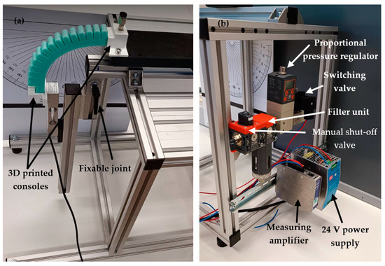 Suitable angle values can be set and fixed on the platform through a fixable joint point. Structural profiles and 3D printed consoles were mounted on both sides of the joint to make it easy to connect any sensor or measuring unit, as shown in Figure 5a. A protractor was also installed to provide the appropriate angle settings during measurements. The operating and data collection units were placed on the back of the platform. The compressed air system includes a METALWORK REG Syntesi®SY1 1/8” manual shut-off valve, a METALWORK DEP SY1 filter unit, a METALWORK EB 80 proportional pressure regulator that allows pressure to be adjusted with kPa accuracy, and finally a METALWORK PLT-10 3/2 electrically operated switching valve. The signals from the measuring cell are processed using an HBM ClipX measuring amplifier and the data is transmitted to the computer. The air system and the measuring amplifier are powered by a MEAN WELL NDR-240-24 type power supply with 24V DC voltage, as shown in Figure 5b.