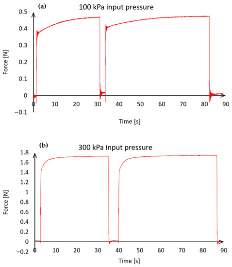 The actuator responds immediately to the input pressure, however, the force varies as a function of time. The development of the appropriate force magnitude could take up to 30 s at low pressure (Figure 6a). At a higher operating pressure (300 kPa), the force that can be considered constant builds up faster, in about 10 s (Figure 6b). The aim of this study is to determine the magnitude of the force in a steady state by inserting plates of different sizes. Therefore, even at low pressure values, the maximum force must be allowed to build up. Each measurement result was therefore recorded 30 s after the pressure signal was issued in order to always achieve a steady state for data acquisition.