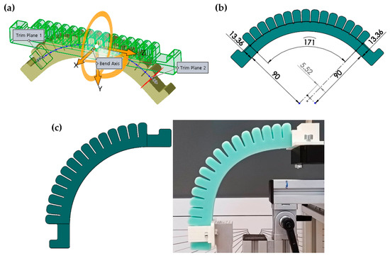 Determination of the data required to create an ideal bending curve for measurements: (a) 90 ° bending curve modeling on the soft actuator in SOLIDWORKS 2016, (b) Determining the distance from the hinge point required to create an ideal bending curve, (c) Comparison of modeled bending and actual bending.
