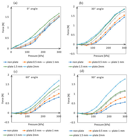 As can be seen in Figure 8a, there is no significant difference in the actuator force exertion between the different-sized plates when positioned at a 0° angle. Without a plate and with the thickest 2 mm plate, the actuator was able to exert approximately 1.5 N of force on the load cell.