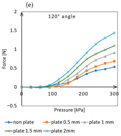 As the angle value increased (Figure 8b), the plates placed between the chambers increases bending performance, as the actuator is able to exert greater force at lower pressure levels as compared to the absence of plates. From a 60° angle position (Figure 8c), it can be observed that the curves are clearly separated from each other and the force exertion increases with increasing plate thickness at a given pressure. The measurements taken at a 90° angle position (Figure 8d) showed the largest differences in force exertion. In this position, the plate-less actuator was capable of exerting 0.57 N of force, while the one equipped with a 0.5 mm plate produced 0.82 N, 1 mm plate produced 1.14 N, 1.5 mm plate produced 1.17 N, and the one with a 2 mm plate produced 1.77 N of force. The actuator was able to exert three times the force with the help of the 2 mm plates compared to the plate-less one. Even at the largest tested bending angle (120°), significant differences were observed in the force exerted by the actuators equipped with different plates (Figure 8e). In this position, the plate-less actuator was capable of exerting 0.53 N of force, while the one equipped with a 0.5 mm plate produced 0.68 N, 1 mm plate produced 0.91 N, 1.5 mm plate produced 1.09 N, and the one with a 2 mm plate produced 1.43 N of force. The results show that even the thinnest plate could produce a significant increase in force, but the best performance was achieved with the 2 mm thick plate, which showed more than a two-and-a-half times increase in force compared to the plate-less version.
