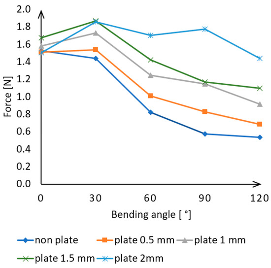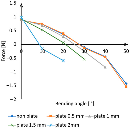 The initial values show a positive force direction, as in this position, the force cell was subjected to a compressive force due to the deformation caused by the gravitational force of the actuator. This compressive force gradually decreased with increasing angle, as the actuator can only perform limited deformation in this direction due to its elasticity. It is evident that the measurement results without the plate and the measurements with the 0.5 mm plate closely follow each other, with the required force for deformation being almost identical in both cases. Therefore, the thinnest plate has little effect on lateral bending.