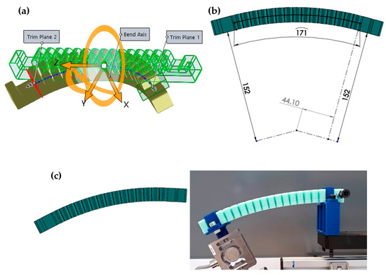 During the measurement, the bending angle varied from 0° to 50° in 10° increments, as a 50° sideways deflection is considered significant for wearable applications. The necessary data for proper positioning of the actuator was determined using the Flex feature of the SOLIDWORKS 2016 3D design program (Figure 10a).