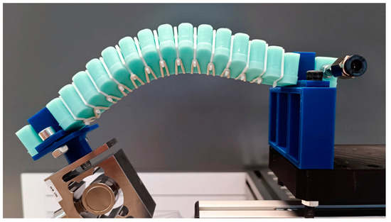 The geometrical parameters of the actuator were determined to resemble actuators used in rehabilitation devices or exoskeletons. Therefore, the actuator has a length of 231 mm, a width of 20 mm, and consists of 15 chambers. Segments were designed at the front and rear of the actuator to facilitate the attachment of the device during the measurements, which is discussed in a later section.