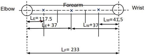 The study participants did not have significant differences in forearm length, so the average forearm length was used as a parameter to obtain biometric information. The average forearm length of the study participants was 23.3 cm. Figure 1 shows the biometric dimensions of the actuator placement along the forearm.