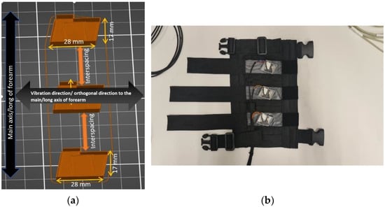 The enclosures were placed along the dorsal forearm in a 3 × 1 array (longitudinal orientation) perpendicular to the forearm’s length (Figure 3a,b). The spacing between the actuators was 20 mm. The decision to use this distance was based on our previous study [17], which was carried out to determine the spacing between voice coil actuators that provides the highest localization accuracy when design convenience with L5 actuators is considered.