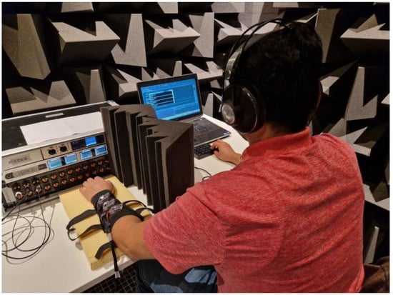 The experiment was conducted in an anechoic chamber at the University of Iceland. Participants were seated on a chair in front of a laptop. The wearable vibrotactile sleeve was placed on the left forearm with the tactile actuators on the dorsal side. Participants placed their forearms on a foam pad (on a table) with the palm facing down. Their view of their left arm was blocked by placing foam in the line of sight to prevent any potential visual biases in responses (such as from visible vibrations).