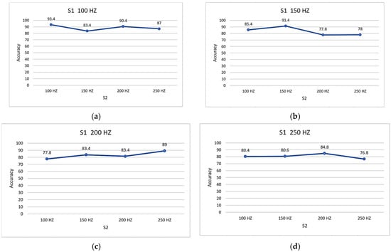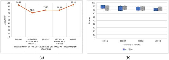 Overall, there was no statistically significant effect or interaction related to frequency, neither for S1 nor S2. This means that the frequency of the stimuli had a negligible effect on performance for both S1 and S2, at least within the tested frequency range (which, as explained above, should be optimal for vibrotactile stimulation), while the amplitude was kept constant. The average accuracy rate along the forearm ranged from 71.25% to 79.25%, which is notably lower than the accuracy rates near the wrist and elbow (94.43% and 95.18%, respectively).