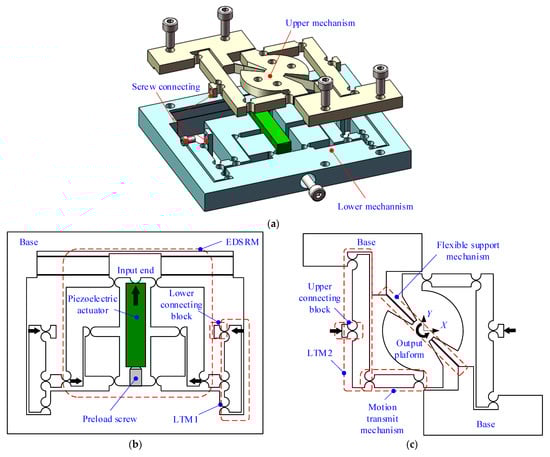 The proposed pure rotary actuator is shown in Figure 1a, which includes double-layer flexible mechanisms with a thread-connected base. The lower mechanism shown in Figure 1b displays a symmetrical layout. The piezoelectric ceramic is utilized as the actuator, one side of which is contacted with the input end and the other side is preloaded with a screw. A half column is designed on the input end to avoid the piezoelectric ceramic suffering a bending moment. A dual leaf parallelogram hinge (DLPH) is connected on two symmetric traditional Scott–Russell mechanisms to organize the enhanced double Scott–Russell mechanism (EDSRM), which has been demonstrated to possess excellent dynamic properties []. The EDSRM is utilized to amplify the input displacement and transfer the single translation to the symmetric and contrary translation. Afterwards, the displacements are secondly amplified via the lever type mechanism of the lower mechanism (LTMlow).