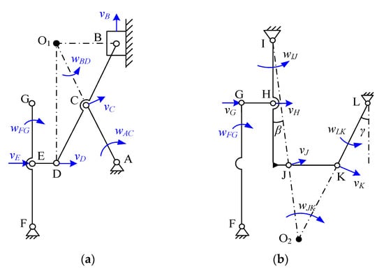 where lAC, lEF, lFG, lIH, lIJ, lJK and , , , , , are the length and angular velocity of the corresponding linkages, respectively. , , , , and are the rotation radii of the corresponding revolute joints, which could be easily calculated using the sine theorem of triangles.