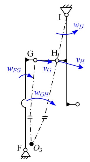 Furthermore, the velocity diagrams of the connecting block, which are shown in Figure 2, are analyzed using the pseudo rigid body theory. The right circular hinges are simplified as a revolute joint and marked as A–K, and the FSM is regarded as the revolute joint L due to the actual rotary motion of the output platform. The linkage GH is the connection bar between the lower and upper mechanism. If the rotation centers of output hinge F and fulcrum hinge G of LTMlow as well as the input hinge I and fulcrum hinge H of LTMup are respectively designed in a strictly straight line, the velocity of flexure hinge G will be same as flexure hinge H, and the linkage GH will generate translational motion as an integral. Otherwise, there will be a rotary motion on the linkage GH, as shown in Figure 3, which may result in the separation of the two connecting blocks. Therefore, the flexure hinge positions of LTMlow and LTMup are designed as in Figure 2.