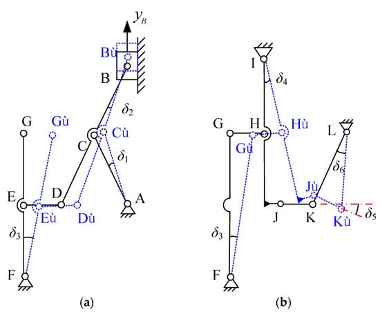 As shown in Figure 4, the linkages AC, BD, FG, IJ, JK and KL generate rotation angles δ1, δ2, δ3, δ4, δ5 and δ6, respectively, and the rotation of linkages DE and GH are ignored for the approximate translational motion. Based on the formula of arc length, the rotation angles of revolute joints A–L are calculated using the following equations: