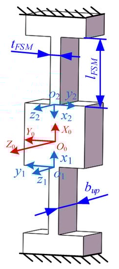 The revolute joint L is simplified from the FSM, which includes two leaf spring hinges. The compliance matrix of flexure hinges has been widely applied to analyze the stiffness of flexible mechanisms [,,,]; thus, it is used to model the rotational stiffness of the revolute joint L in this paper. As shown in Figure 5, the local coordinates of leaf spring hinges are expressed as oi-xiyizi, and the global coordinate O0-X0Y0Z0 is defined in the center of the output platform. The compliance matrix of the leaf spring hinge in the local coordinate is expressed as