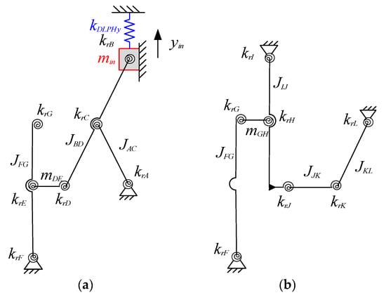 where the first term denotes the virtual work caused by the input force FyB and the virtual displacement . The second term denotes the virtual work of the DLPH due to the deformation of DLPH and elastic force FDLPHy. As shown in Figure 6, the third term is the virtual work caused by torsional springs with rotary torque and virtual angular deformation . The relationships between and are same as those between and .