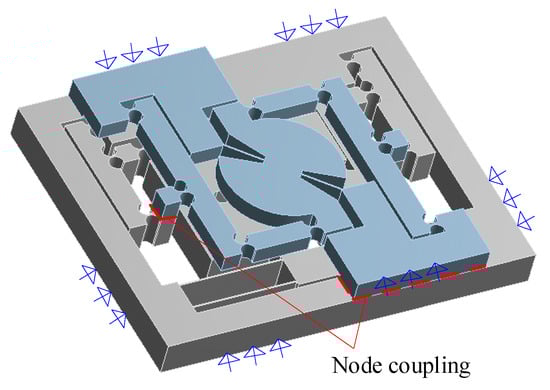 In the FEA modeling of the RA-DFM, the lower and the upper mechanisms are firstly modeled separately based on the optimized parameters, which are then formed into a new part in Workbench software to couple the nodes between the related bases and connecting blocks, and the threaded connections are simplified as rigid connections to reduce the structure complexity. Aluminum alloy is selected as the material, with Young’s modules E = 71 GPa, density ρ = 2770 kg/m3 and Poisson’s ratio ν = 0.33. The RA-DFM is meshed using the adaptive method with 0.5 mm element size; the whole mechanism is meshed in 347,947 elements. The surrounding surfaces are completely fixed in the following simulation, as shown in Figure 7.