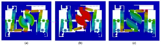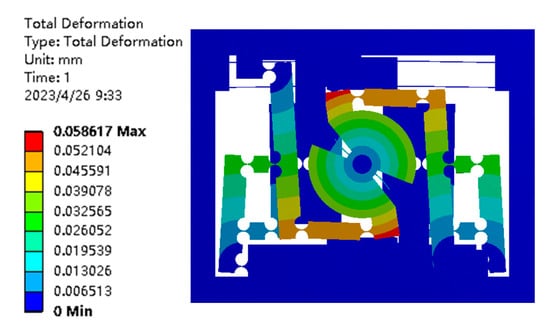 An input force Fin = 10 N is applied on the input end in the Y direction to examine the input stiffness of the RA-DFM; the total deformation is shown in Figure 8. The input end translates in the Y direction by 5.83 μm, and the output platform generates a rotary angle as in the design. The input stiffness of RA-DFM is calculated as 1.71 N/μm, and the modeling error is 2.34% compared with the theoretical result of 1.75 N/μm, indicating the correctness of the theoretical model. In order to guarantee the output of the piezoelectric ceramic, the stiffness of the piezoelectric ceramic is preferred to exceed 10 times that of the external mechanism.