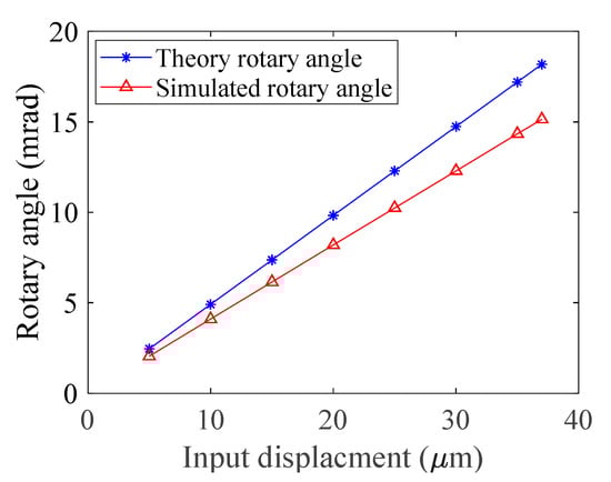 The space reserved for the piezoelectric ceramic is 13 × 10 × 43.11 mm, which is suitable for commercial piezoelectric ceramic (MTP150/7 × 7/36, Coremorrow, Harbin, China). The nominal output displacement and stiffness are 38 μm and 50 N/μm, respectively. Based on Equation (24), the actual output of the selected piezoelectric ceramic is about 37 μm. A series of inputs yin = [5, 10, 15, 20, 25, 30, 35, 37] μm is used to assess the output property. As shown in Figure 9 and Table 2, the output rotary angle is almost linear to the input displacement, and the total simulated amplification ratio of the RA-DFM is about 8.42, which is obviously less than the theoretical calculation of 10.10. The separate amplification ratios of the three amplification mechanisms are simulated as 1.78, 2.82 and 1.67, respectively. The largest modeling error occurs at the EDSR mechanism; it is because the rest of the flexible mechanisms generate a large load on the output terminal of the EDSR mechanism, which leads to serious deformation of the right circular hinges A and C in the X direction as well as the rotation. In addition, the linkages of the EDSR generate much more deformation compared to the lever-type mechanism.