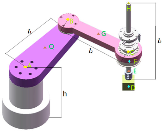 Assume that the centroid of end-effector HE in Figure 2 is point F and the load centroid is point D. Then the end-effector HE and the load are regarded as a whole and expressed as FD, and the equivalent centroid point of the two is . When the load is a variable, the coordinates of the centroid E of the end-effector FD are as follows: