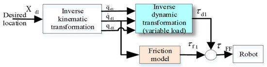 Under the condition of variable load, the load has the characteristics of time-varying and nonlinear strong coupling. In this case, the dual-torque feedforward decoupling control method is proposed for the measurable but uncontrollable friction torque and the disturbance torque caused by the operation of the variable load. Meanwhile, as the feedforward control has difficulty resisting other unknown disturbances, the fuzzy computational torque feedback control method is adopted to improve the stability and motion accuracy of the system. The control block diagram of the system after the combination of the two is shown in Figure 3.
