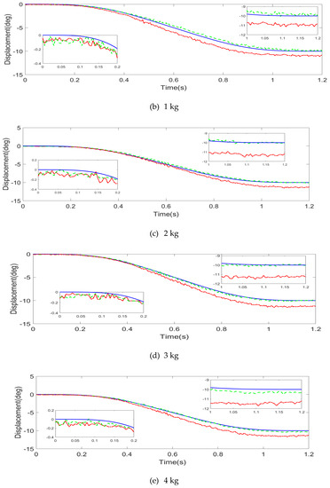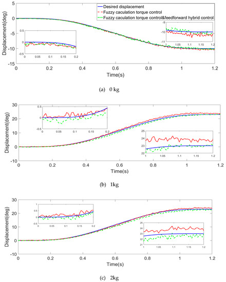 By Figure 10, Figure 11 and Figure 12, at different loads within 0–5 kg, three driving joints of 4-DOF parallel robotic angular displacements of the experiment are close to the planned trajectory, both in fuzzy computing torque feedback control, and fuzzy calculation and feedforward torque hybrid control. Two kinds of control modes of the angular displacement track are bigger than the planned value because of the influence of accumulated error, and the deviation increases with the increase in movement time. Additionally, the overall motion deviation of the robot under the hybrid torque control is less than that of the fuzzy computational torque feedback control.