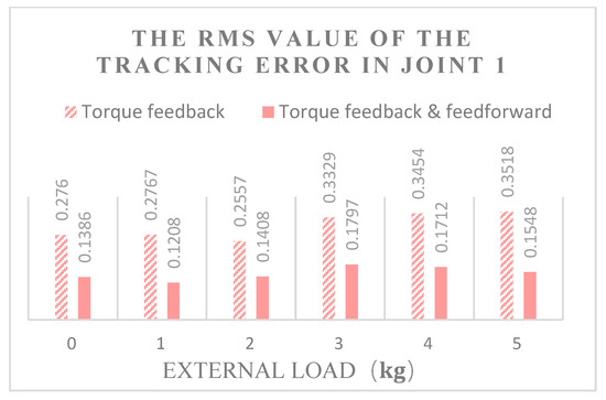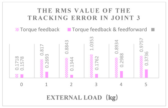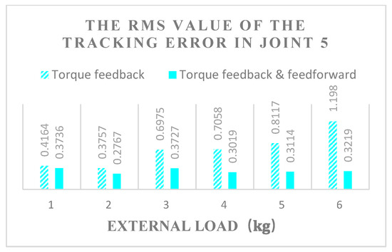 It can be seen from Figure 13, Figure 14 and Figure 15 that joints 1, 3, and 5 are under different loads of 0–5 kg. As the load increases, the RMS value of the displacement error increases in the fluctuation, and all of their tracking error RMS values in the feedback and feedforward torque hybrid control are less than in one without feedforward control. When the external load is 0, the RMS value of the tracking error of the torque hybrid control is slightly lower than that of the torque feedback. Through calculation, the root values of the trajectory tracking error of feedback and feedforward torque hybrid control in three driving joints are 49.87%, 70.48%, and 50.37% lower, respectively, than that of torque feedback on average; thus, it is concluded that the motion accuracy under torque feedback and feedforward hybrid torque control is higher than that of pure torque feedback control.
