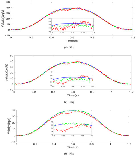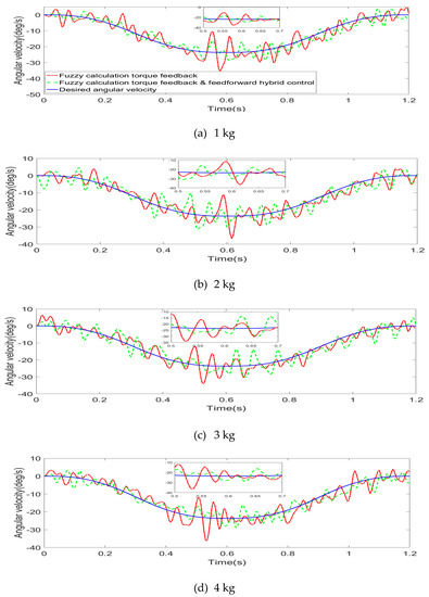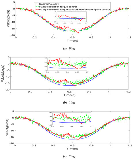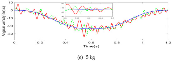 By differentiating angular displacement and filtering, feedback control and feedback and feedforward hybrid control are obtained under 0–5 kg load and different external loads. Figure 16, Figure 17 and Figure 18 show the comparison of the angular velocity under feedforward compensation control.