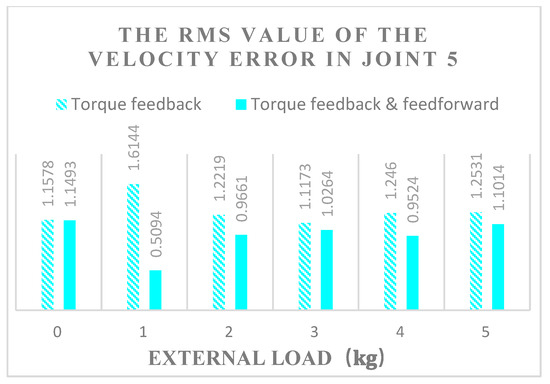 It can be seen from Figure 19, Figure 20 and Figure 21 that when there is no load, the RMS values of the velocity error of joints 1, 3, and 5 in the torque hybrid control are slightly lower than those of the torque feedback. With the increase in load, the RMS value of velocity error increases in fluctuation, and the overall trend is upward. Through calculation, the average RMS values of the three driving joints’ speed error under torque feedback control are 4.3879, 1.3709, and 1.2684, respectively; the average RMS values of speed error under torque feedback and feedforward control are 3.3632, 1.1288, and 0.9508, respectively; and the speed stabilities of torque hybrid control are relatively higher by 23.35%, 17.66%, and 25.04%, respectively.