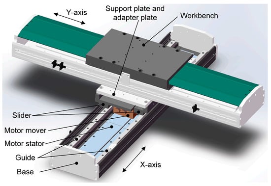 This study focuses on the X-Y two-axis linkage linear motor feeding system, which employs a permanent magnet synchronous linear motor (PMSLM) as the driving component to achieve high-speed and high-precision trajectory movement. The X and Y axes are arranged orthogonally, and the structure is depicted in Figure 1. The stator of the linear motor is fixed to the machine tool, and the mover is rigidly connected to the workbench. The movers of both axes are coupled and generate electromagnetic thrust upon applying an electric current. This, in turn, propels the rigidly connected workbench along the guideway to enable linear movement in the feed direction.