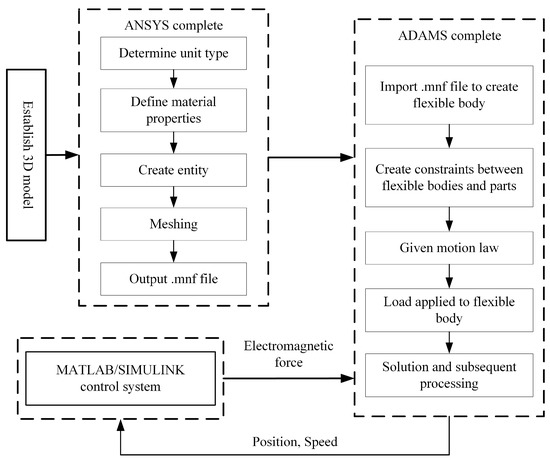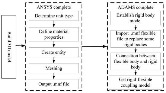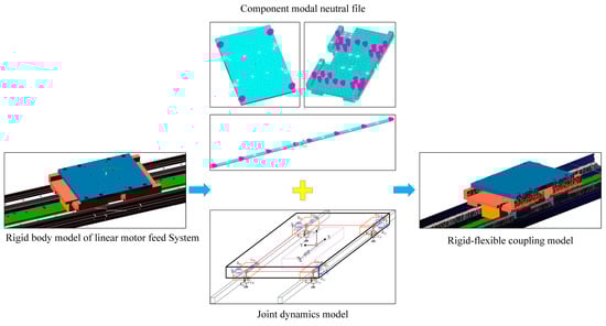 The linear motor mechanical feeding system comprised both rigid bodies and flexible bodies. The motion of rigid bodies can be analyzed and calculated using the theory of multirigid body dynamics, while the motion of flexible bodies with large deformations can be analyzed using the dynamics of a multiflexible body system. The modelling process of the rigid–flexible coupling model is illustrated in Figure 3. First, a three-dimensional model of the flexible component is established, and then it is imported into the finite element analysis software ANSYS to output the modal neutral file after flexible processing. Finally, the generated modal neutral file is introduced into ADAMS to establish a connection between the rigid body and the flexible body, resulting in the creation of the model.